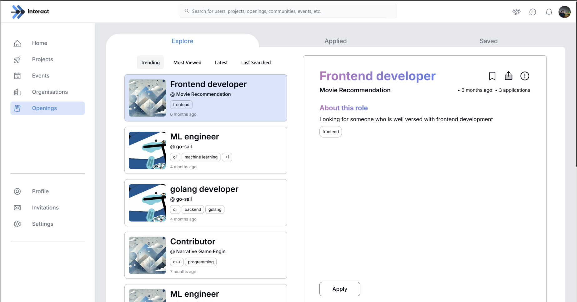 Then I got into the product and realised the obvious thing I had missed. Finding people was only half the problem. What happened after someone joined your project? There was nowhere to go. No way to track tasks, assign work, link a GitHub PR to a ticket, manage who could do what inside a project. So I built that too. Custom RBAC, task tracking, Figma and GitHub integrations inside tickets. Interact was no longer just a place to find collaborators. It was where you actually worked with them.